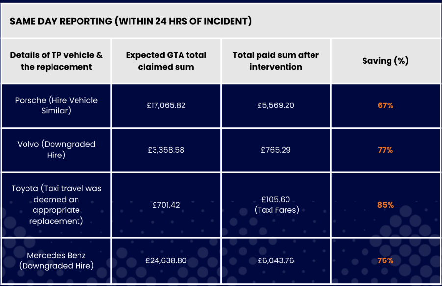Claims reported within 24 hours regularly see hire costs reduced by up to 85%, simply by stopping unnecessary credit hire and reassessing what replacement vehicles are actually needed.